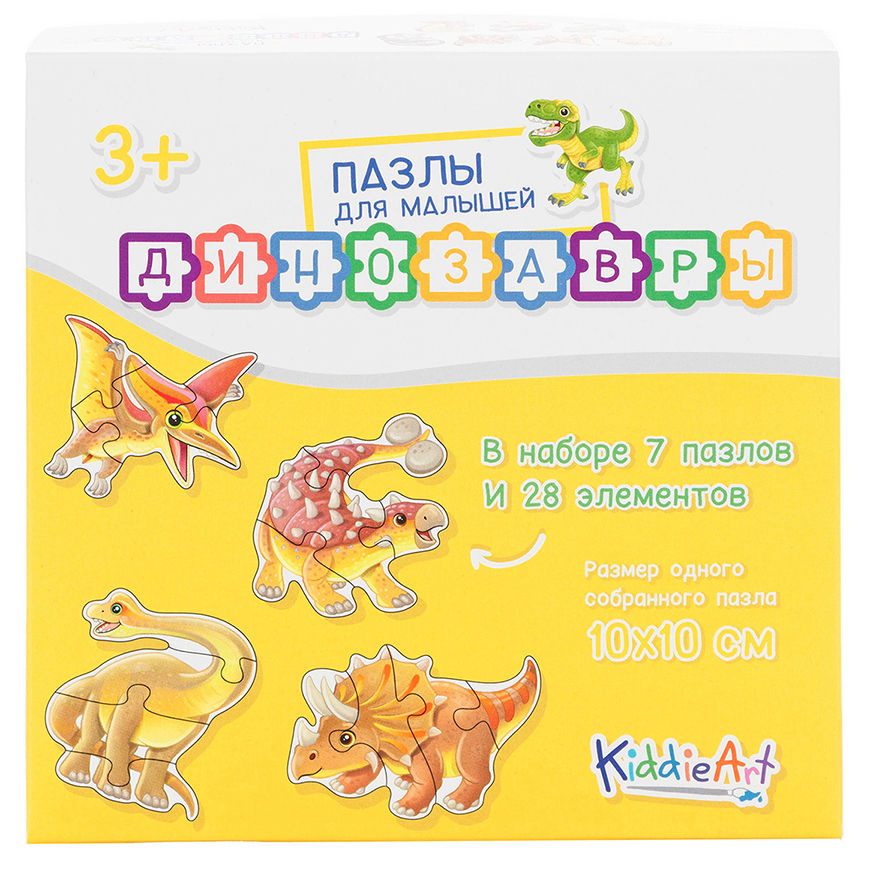 Картонные пазлы для малышей от KiddieArt – это отличный способ ребенку изучить окружающий мир. Каждый пазл выполнен в уникальном дизайне в виде персонажа (животных, фруктов, транспортных средств и прочее), собирается из нескольких деталей, с помощью которых по мере сборки можно увидеть всю головоломку размером 10x10см. Маленький исследователь будет с удовольствием рассматривать собранные фигурки динозавров в виде тиранозавра, птеродактиля, трицератопса, брахиозавтра, анкилозавра, стегозавра, спинозавра. Все персонажи выполнены в ярких цветах с присущими им деталями древних предшественников. Подходит для детей от 3-х лет. Содержит 28 деталей.