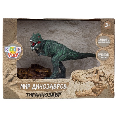 Тираннозавр – самый известный представитель могучих, давно живших на нашей планете рептилий. Изучайте царство динозавров вместе с KiddiePlay! Тираннозавр имеет зелено-синий окрас и ярко-красные глаза. Игрушка является частью коллекции KiddiePlay «Мир динозавров». Соберите всех древних рептилий! Длина динозавра – 17 см. Рекомендованный возраст: 3+. В набор входят: тираннозавр и камень, выполненный из пластика