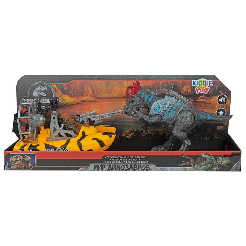 Отправьтесь в путешествие в мир динозавров с новым набором от KiddiePlay. В набор входит фигурка динозавра и желто-черная лодка с пушкой. Фигурка динозавра выполнена в аутентичном цвете, имеет реалистичную детализацию. У игрушки есть подвижные соединения: челюсть, задние и передние конечности. При нажатии на кнопку, расположенную на спине игрушки, она издаст рычащий звук и часть головы подсвечивается красным цветом. Пушка, установленная на лодке, свободно вращается. Игрушка изготовлена из качественных материалов. Рекомендованный возраст: 3+