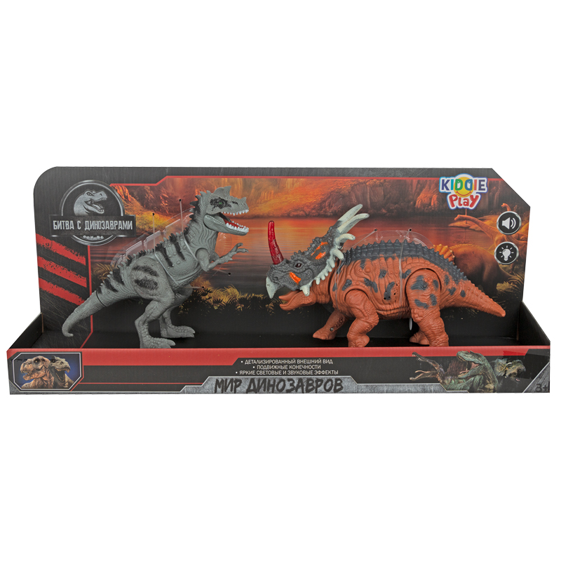 Станьте свидетелем сражения двух могучих динозавров с новым набором от KiddiePlay! Игрушки имеют уникальный и яркий дизайн, который привлечет внимание любителей мира динозавров. Фигурки динозавров выполнены в аутентичном цвете и имеют реалистичную детализацию. Карнотавр имеет серую окраску с темными полосами на спине. Трицератопс имеет подвижные соединения: голова, задние и передние конечности. При смене положения задней ноги трицератопса игрушка издает рычащий звук и часть головы подсветится красным цветом. Игрушка изготовлена из качественных материалов. Рекомендованный возраст: 3+. В набор входят: трицератопс и карнотавр.