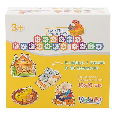Картонные пазлы для малышей от KiddieArt "Сказка Курочка Ряба" — это отличный способ изучить окружающий мир. Каждый пазл выполнен в уникальном дизайне в виде персонажа (животных, фруктов, транспортных средств и прочее), собирается из нескольких деталей, с помощью которых по мере сборки можно увидеть всю головоломку размером 10x10см. Яркие, наглядные картинки, выполненные по мотивам известной сказки «Курочка Ряба», отлично подойдут для ознакомления ребенка с русским фольклором, а также способствуют получению новых полезных знаний. Ребенок с удовольствием соберет 7 картонных пазлов в виде бабки, деда, курочки Рябы, избы, мышонка, разбитого золотого и целого простого яйца. Пазл расширяет кругозор ребенка, знакомит с персонажами известной русской народной сказки. Подходит для детей от 3-х лет. Содержит 28 деталей.