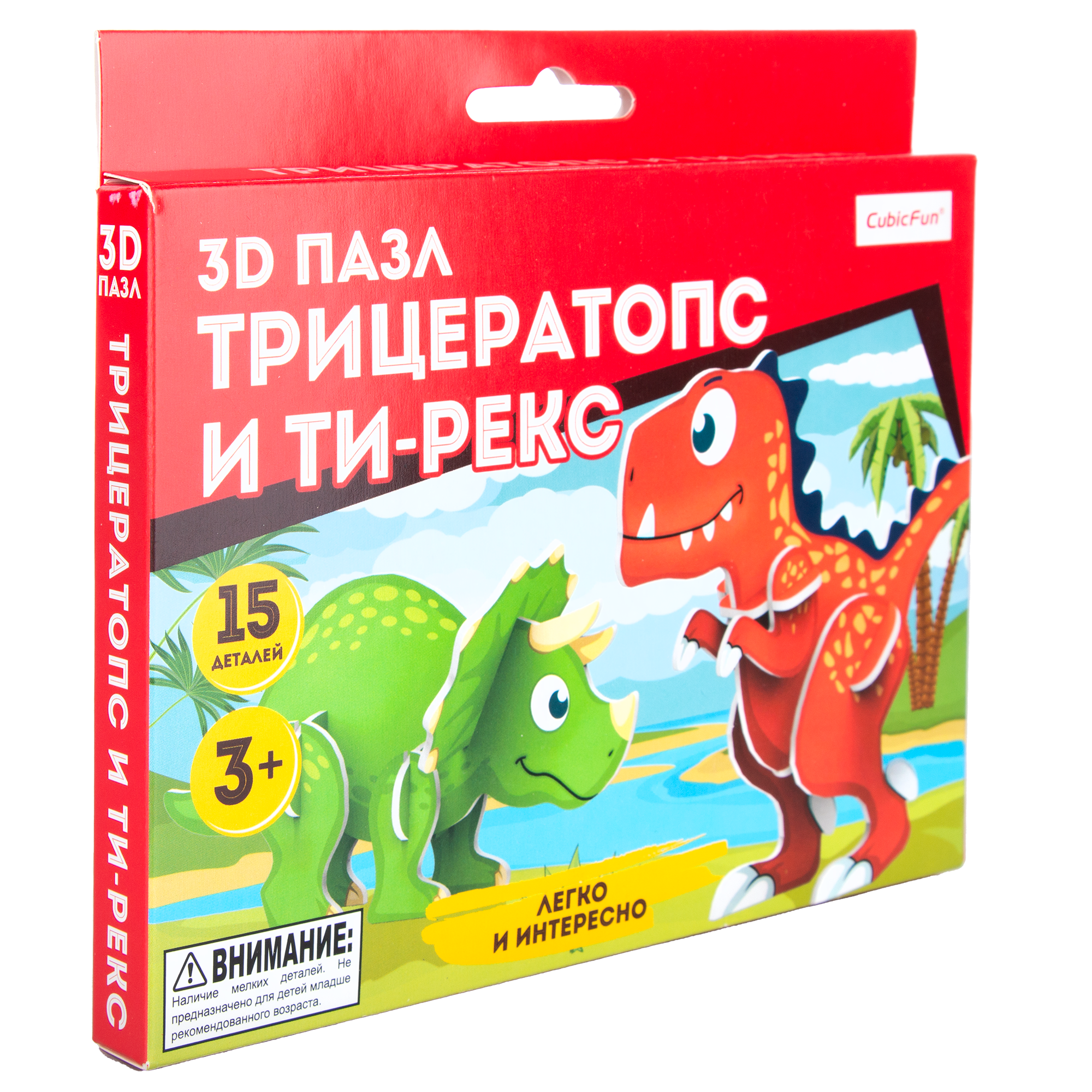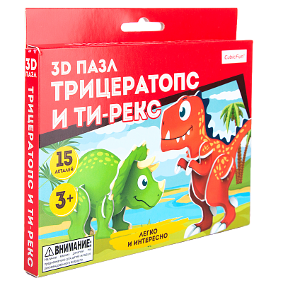 3D Пазл Ти-Рекс и Трицератопс,15 деталей. Новая серия компактных 3D пазлов от CubicFun отлично подойдет для сборки самым маленьким детям! Небольшое количество крупных деталей позволит ребенку запросто собрать красивый 3D пазл. Собранный пазл представляет из себя двух милых динозавриков - Ти-Рекса и Трицератопса; Малыш с увлечением будет собирать красивые 3D пазлы; Высокое качество материалов, абсолютно безопасны для детей; Крупные детали и простая подробная инструкция позволит малышу легко собрать пазл даже самостоятельно; Для сборки модели не потребуется клей или ножницы; Сборка пазла развивает мелкую моторику ребенка; Модель состоит из 13 деталей; Рекомендованный возраст: 3+