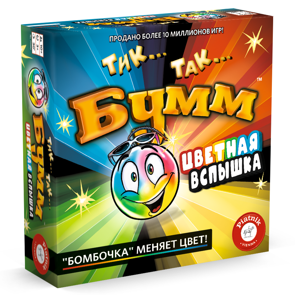 Яркая новинка в популярной линейке игр ""Тик Так Бумм"" с цветной вспышкой на тикающей бомбочке, которой указывает цвет категории с вопросами. Быстрый и правильный ответ даёт право игрокам передать бомбочку дальше и избежать получения штрафного очка. Скорость мышления, находчивость и воображение помогут участникам победить в этой увлекательной и невероятно весёлой игре, ведь бомбочка будет менять свой цвет, а значит и категорию вопросов.
