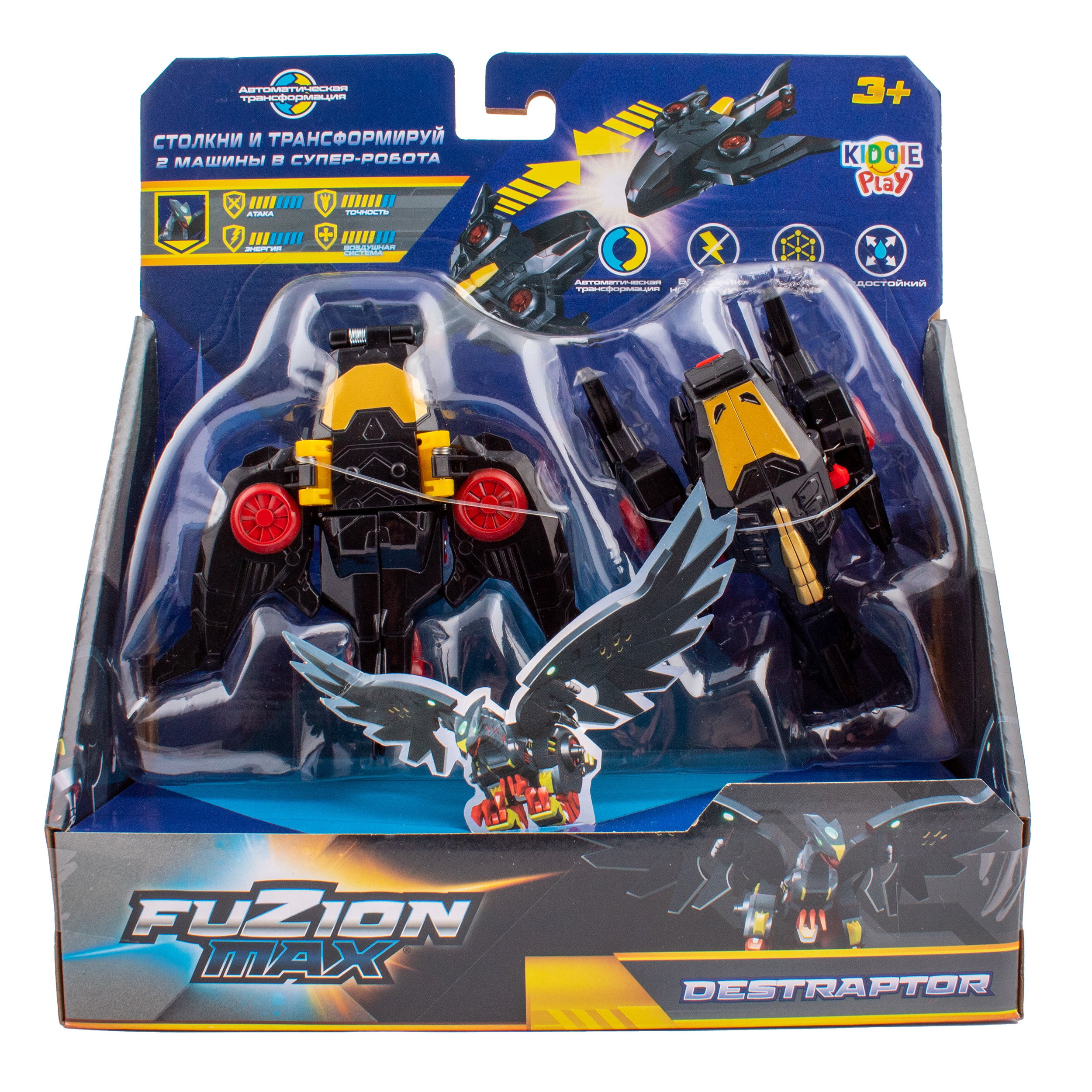 "Дестраптор –, один из главных злодеев из армии анимаботов. Знает, что ему нужно и беспрекословно подчиняется приказам своего хозяина. Всегда готов к бою с синботами и сделает все, чтобы в очередном поединке одержать победу. Характеристики: • Одноименный герой из мультсериала Fuzion Max. Обладает стратегическим мышлением, управляет анимаботами с воздуха, раздавая периодически команды атаки на людей и синботов. • Стихия героя: воздух • Прототип животного: орел; • Два истребителя легко сталкиваются друг с другом и превращаются в одного крутого робота; • Дестраптор без особых усилий может трансформироваться обратно в истребители; • Истребителями можно играть как отдельными друг от друг • Игрушка устойчива к воде; • Для игры не требуются батарейки; • Рекомендованный возраст – 3+."