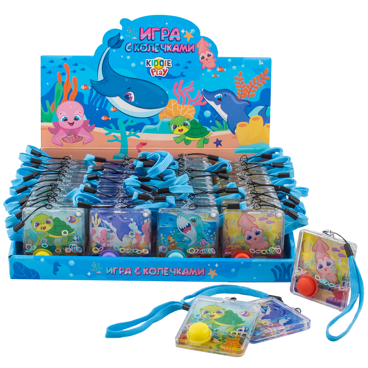 "Получите новое увлечение с игрушкой от KiddiePlay «Игра с колечками». Игрушка сразу привлекает к себе внимание оригинальными рисунками в виде морских обитателей в ярких цветах! • Имеет удобную форму, легко помещается в руках; • Игрушка имеет резиновую кнопку для запуска колечек; • Играть можно как одному, так и соревноваться с друзьями или членами семьи; • Размер игрушки: 7,5 см. х 6,5 см. • Рекомендованный возраст: 3+."