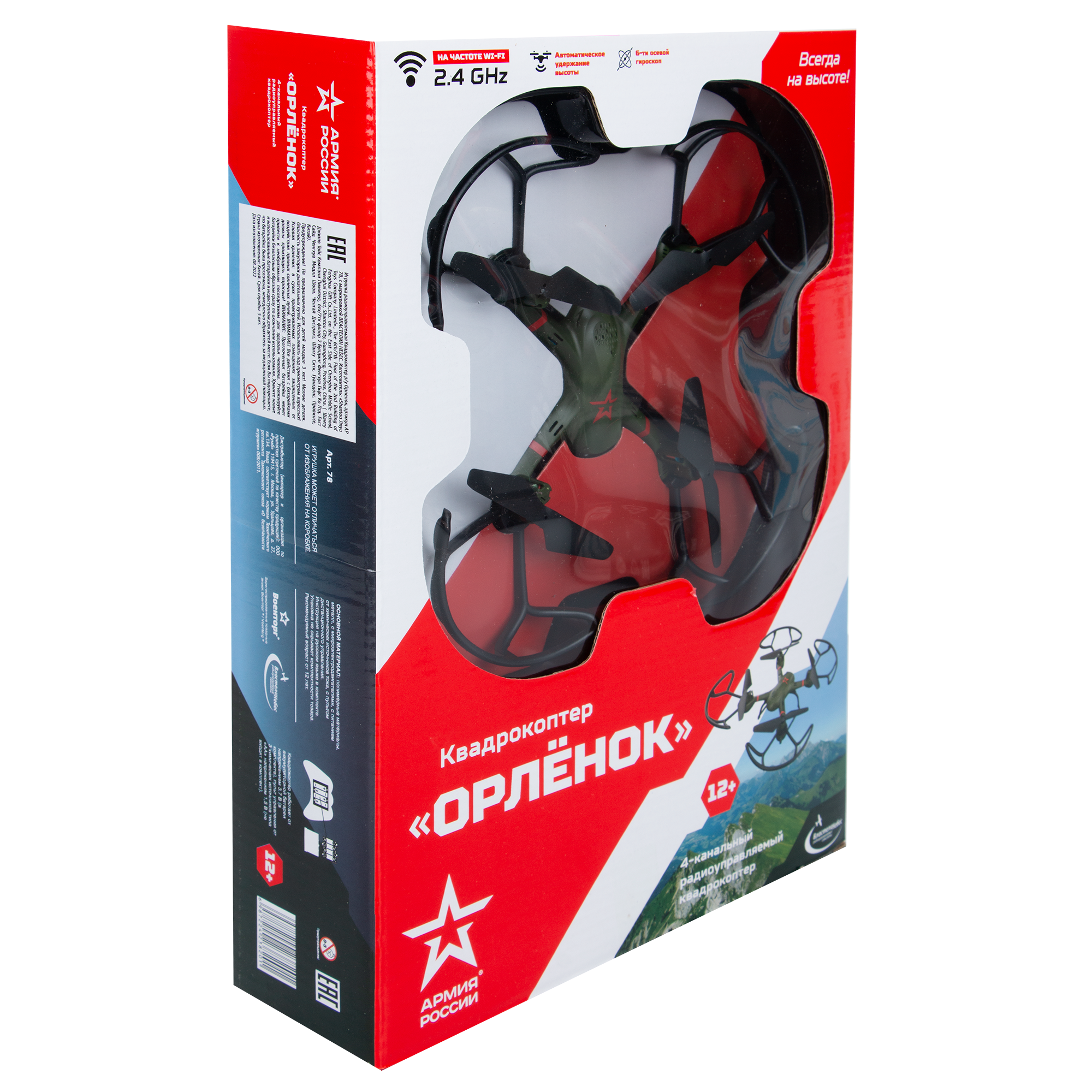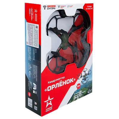 "4-х канальный квадрокоптер от Властелин Небес ""Орленок"" имеет в своем арсенале широкий набор функций, чтобы впечатлить каждого. Быстрый, маневренный, легкий в управлении – квадрокоптер станет прекрасным подарком для юного любителя радиоуправляемых игрушек! Квадрокоптер имеет несколько уникальных функций: • One key return (возврат к месту взлета по нажатию кнопки) • Headless (автоориентация квадрокоптера с пульта управления) • 6-ти осевой гироскоп, которым оснащен квадрокоптер, гарантирует стабильный полет; • Квадрокоптер имеет 3 скорости управления; • Квадрокоптер оснащен яркими полетными огнями, имеет функциональный пульт управления; • Квадрокоптер имеет полное пропорциональное управление: вперед, назад, вправо, влево, повороты вправо и влево, сальто в любую сторону на 360°; Характеристики: • Зарядка вертолета от USB; • Лицензия «Армия России»; • время игры 6–10 мин; • время зарядки 35–40 мин; • Дальность управления до 100 метров, в зависимости от условий полёта; • Предназначен для игры на улице и в закрытых помещениях; • Зарядка вертолета от USB; • Рекомендованный возраст: 12+"