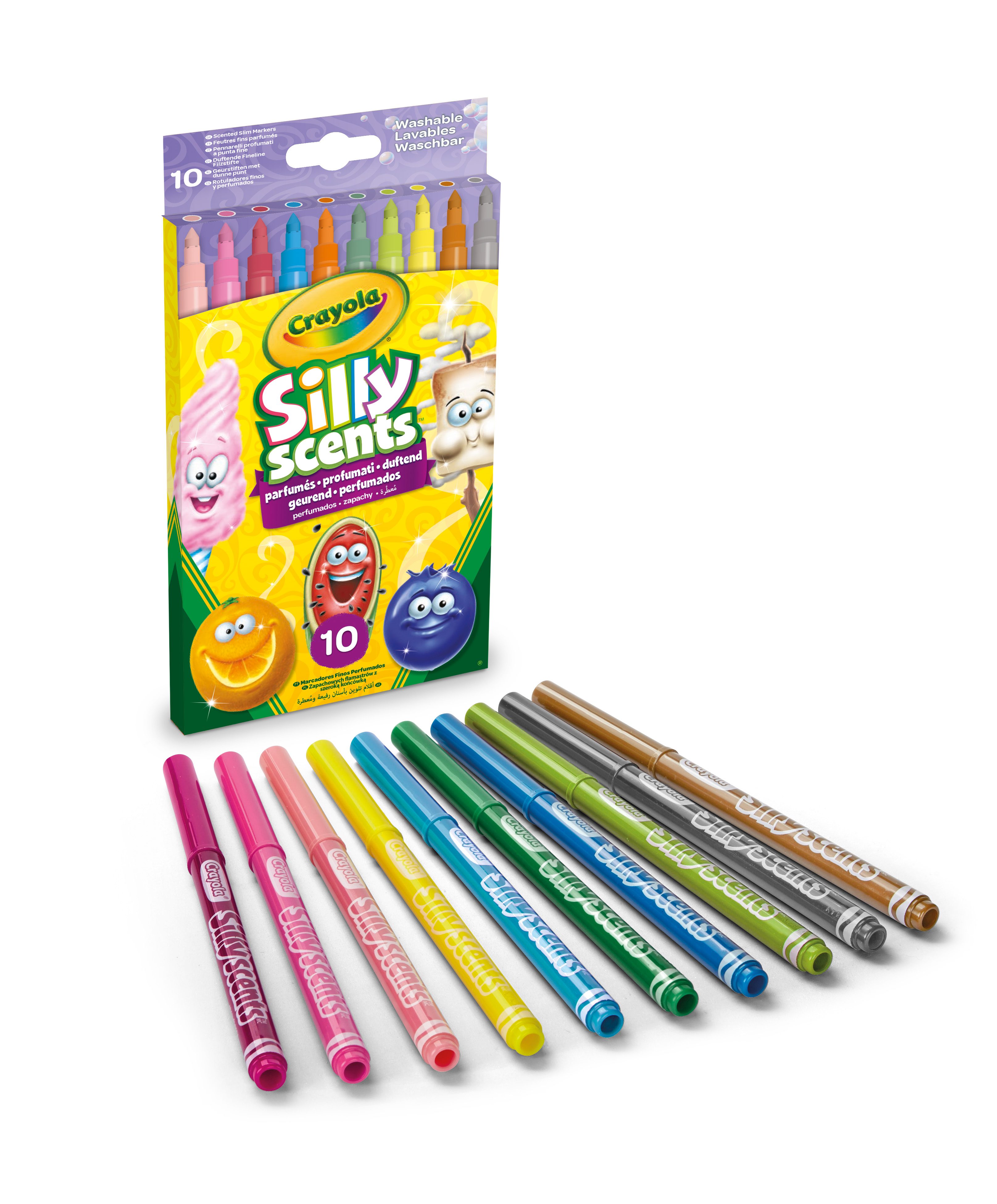 Набор состоит из 10 ароматизированных фломастеров с тонким пером 58-5071 Crayola. Это 10 фломастеров разных цветов, с помощью которых ребёнок можно нарисовать красочные шедевры, а затем подарить их родственникам или украсить комнату. Если он случайно испачкает ручки или одежду, то краску легко отмыть тёплой водой. Каждый фломастер, входящий в данный набор, обладает неповторимым ароматом: клубника, лимон, лайм, сахарная вата и другие.