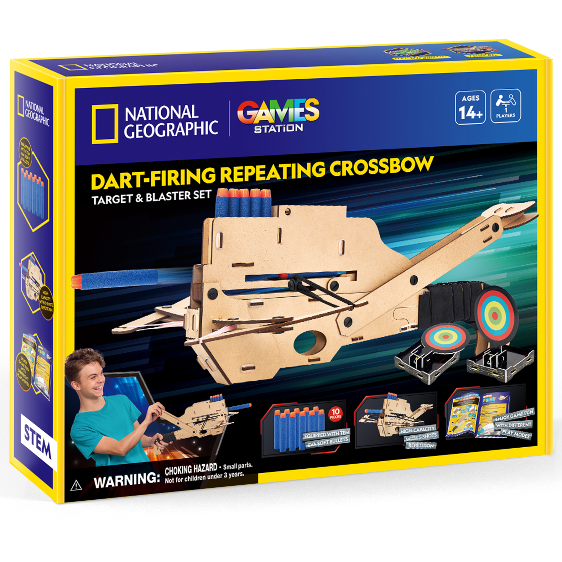 Соревнуйтесь с друзьями в стрельбе из арбалета с новой игрушкой от CubicFun и National Geographic! Оригинальная игрушка дает возможность развить меткость, координацию и концентрацию, а также познакомиться с основами стрельбы из арбалета в игровой форме. Конструкция арбалета выполнена из дерева, дротики – из поролона. Арбалет оснащен механизмом для натяжения тетивы и запуска мягких дротиков. В комплекте идут мягкие дротики, которые безопасны для игры внутри и вне дома. Как играть: • Соберите арбалет, следуя подробным инструкциям, прилагаемым к набору; • Убедитесь, что все детали правильно закреплены и арбалет готов к использованию; • Зарядите арбалет мягким дротиком, вставив его в специальный держатель. • Натяните тетиву, используя механизм натяжения, и зафиксируйте её в заднем положении; • Направьте арбалет на цель, удерживая его двумя руками для стабильности; • Нажмите на спусковой механизм, чтобы выпустить дротик; • Наблюдайте, как дротик летит к цели, стараясь попасть точно в центр. Тренировка и соревнования: • Установите различные цели на разном расстоянии и тренируйтесь в меткости; • Устраивайте соревнования с друзьями, чтобы выяснить, кто из вас самый меткий стрелок. Характеристики: Размер модели: 51,5 x 32,2 x 19,4 cm Рекомендованный возраст: 8+ ВАЖНО: не целиться в лицо противника и играть исключительно с игровыми мишенями