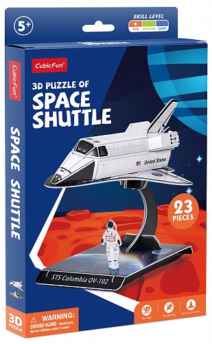 Станьте конструктором настоящего космического шаттла с новым 3D Пазлом от CubicFun. Пазл максимально точно передает все детали настоящего американского шаттла, что приведет в восторг юных любителей космоса! Пазл развивает мелкую моторику, память и внимание ребенка. 3Д Пазл является уменьшенной копией оригинального шаттла, имеет высокую детализацию. Легко собирается без дополнительных инструментов, без ножниц и клея. Пазл изготовлен из качественных материалов. После сборки шаттл можно зафиксировать на аккуратной подставке, тем самым зафиксировав его как новый элемент своей колекции. Количество деталей пазла – 23 шт.; Рекомендованный возраст: 5+ Размер модели: 20,6 x 13,5 x 14,1 см Размер упаковки: 16 х 1,8 х 25 см