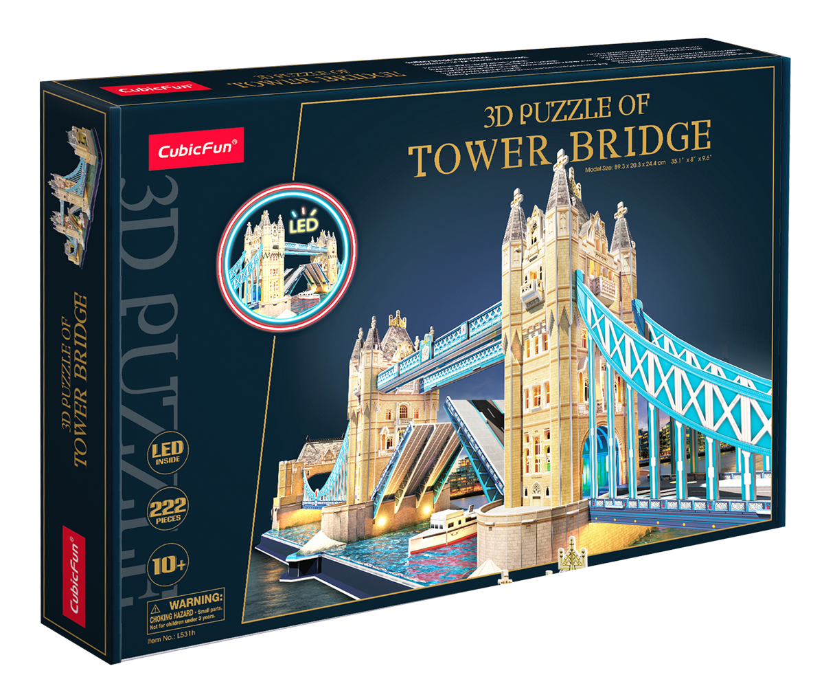 Развивающие 3D-пазлы для детей и взрослых с LED-подсветкой – это лучший подарок для увлеченного путешественника и любителя конструирования. Объемная модель воссоздает архитектуру Тауэрского моста - комбинированного подвесного и разводного моста в центре Лондона над рекой Темзой. Открой конструктор, достань инструкцию и сразу приступай – детали 3d-пазла легко соединяются между собой, а для сборки модели не требуются клей и ножницы. Тауэрский мост с подсветкой будет прекрасным дополнением к интерьеру дома или офиса, создаст особую атмосферу уюта и сможет использоваться как ночник. Все фигурные пазлы Cubic Fun – это высокая детализация, качественные детали и увлекательное хобби для всей семьи, т.к. объемные пазлы подходят для детей и взрослых. В комплекте 222 детали, рекомендуемый возраст: от 10 лет.