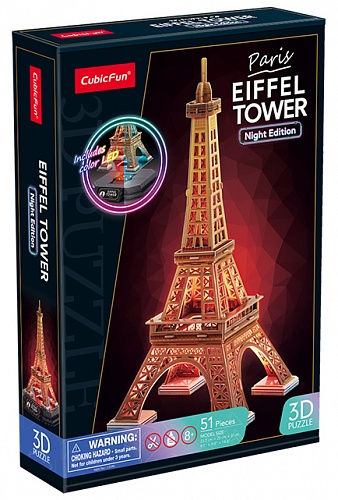 Воссоздайте Эйфелеву башню у себя дома с новым 3D Пазлом с LED-подсветкой от CubicFun! Идеально проработанные детали пазла сделают его прекрасным украшением для любой коллекции. Пазл развивает мелкую моторику, память и внимание ребенка. Увлекательная модель позволит воссоздать культовую достопримечательность, не выходя из собственного дома. Особенностью данной версии является инновационный светодиодный цоколь. Когда переключатель находится в положении «Ⅰ» - Эйфелева башня подсвечивается разными цветами, создавая завораживающий эффект, который добавляет нотку волшебства в любую комнату. В положении «Ⅱ» - основание светодиодной лампы излучает теплый и успокаивающий желтый свет, который идеально подходит для расслабления или создания успокаивающей атмосферы. 3Д Пазл является уменьшенной копией реальной Эйфелевой башни, имеет высокую детализацию. Легко собирается без дополнительных инструментов, ножниц и клея. Пазл изготовлен из качественных материалов. Количество деталей пазла – 51 шт.; Рекомендованный возраст: 5+ Размер модели: 25 x 23,2 x 37 см Размер упаковки: 33 х 22,5 х 6 см Необходимые батарейки: 3 х АА
