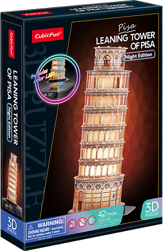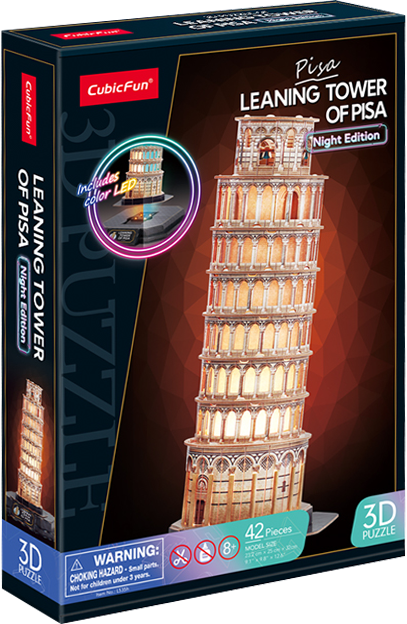 Воссоздайте легендарное архитектурное творение у себя дома и постройте настоящую Пизанскую башню с новым 3D Пазлом с LED-подсветкой от CubicFun! Идеально проработанные детали пазла сделают его прекрасным украшением для любой коллекции. Пазл развивает мелкую моторику, память и внимание ребенка. Особенностью данной версии является инновационный светодиодный цоколь. Когда переключатель находится в положении «Ⅰ» - Пизанская башня подсвечивается разными цветами, создавая завораживающий эффект, который добавляет нотку волшебства в любую комнату. В положении «Ⅱ» - основание светодиодной лампы излучает теплый и успокаивающий желтый свет, который идеально подходит для расслабления или создания успокаивающей атмосферы. 3Д Пазл является уменьшенной копией реальной Пизанской башни, имеет высокую детализацию. Легко собирается без дополнительных инструментов, ножниц и клея. Пазл изготовлен из качественных материалов. Количество деталей пазла – 42 шт.; Рекомендованный возраст: 5+; Размер модели: 25 x 23,2 x 32 см; Размер упаковки: 33 х 22,5 х 6 см; Необходимые батарейки: 3 х АА.