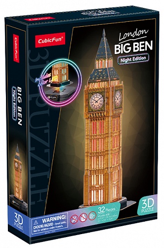 Воссоздайте у себя дома копию всемирно известной достопримечательности – Биг-Бена. Детально проработанные детали пазла сделают его прекрасным украшением для любой коллекции, а приятная LED-подсветка впечатлит как детей, так и взрослых. Особенностью данной версии является инновационный светодиодный цоколь. Когда переключатель находится в положении «Ⅰ» - Биг-Бен подсвечивается разными цветами, создавая завораживающий эффект, который добавляет нотку волшебства в любую комнату. В положении «Ⅱ» - основание светодиодной лампы излучает теплый и успокаивающий желтый свет, который идеально подходит для расслабления или создания успокаивающей атмосферы. Пазл развивает мелкую моторику, память и внимание ребенка. 3Д Пазл является уменьшенной копией реальной достопримечательности, имеет высокую детализацию. Легко собирается без дополнительных инструментов, ножниц и клея. Пазл изготовлен из качественных материалов. Пазл Биг-Бена расположен на красивой подставке с подписью. Характеристики: Количество деталей пазла – 28 шт.; Рекомендованный возраст: 5+; Размер модели: 25 x 23,2 x 42 см; Размер упаковки: 33 х 22.5 х 6 см; Необходимые батарейки: 3 х АА.