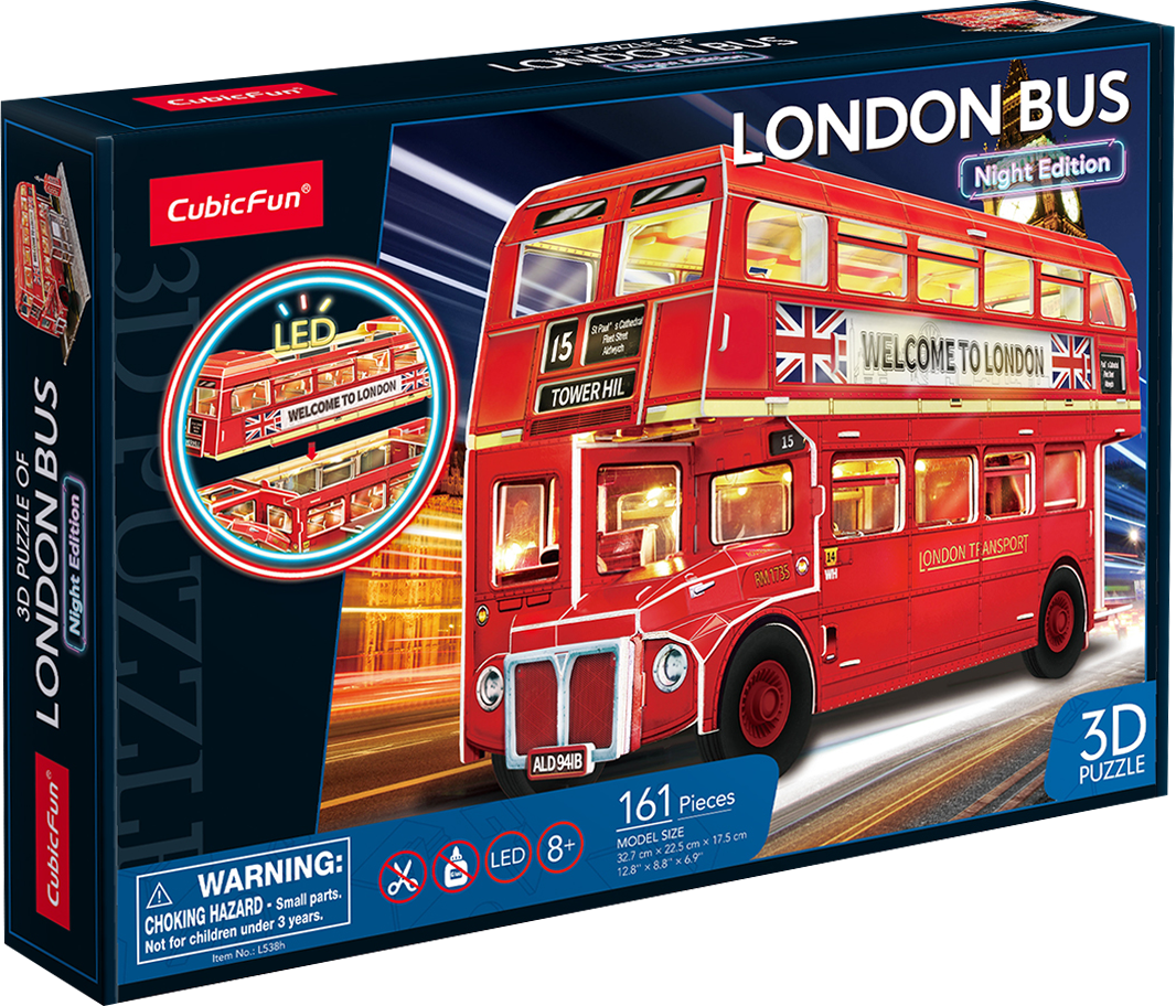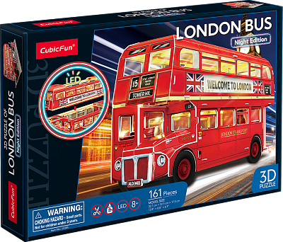 Почувствуйте себя туристом на экскурсии в Англии с новым набором от CubicFun! Модель имеет оригинальный дизайн, приятно освещается LED-подсветкой. Пазл развивает мелкую моторику, память и внимание ребенка. Увлекательная модель позволит воссоздать культовый двухъярусный туристический английский автобус, не выходя из собственного дома. 3Д Пазл является уменьшенной копией реального транспорта имеет высокую детализацию. Игрушка станет отличным дополнением любой коллекции, а ее дизайн впечатлит как ребенка, так и взрослого! Легко собирается без дополнительных инструментов, ножниц и клея. Пазл изготовлен из качественных материалов. Характеристики: Количество деталей пазла – 161 шт.; Рекомендованный возраст: 5+; Необходимые батарейки: 3 х АА.