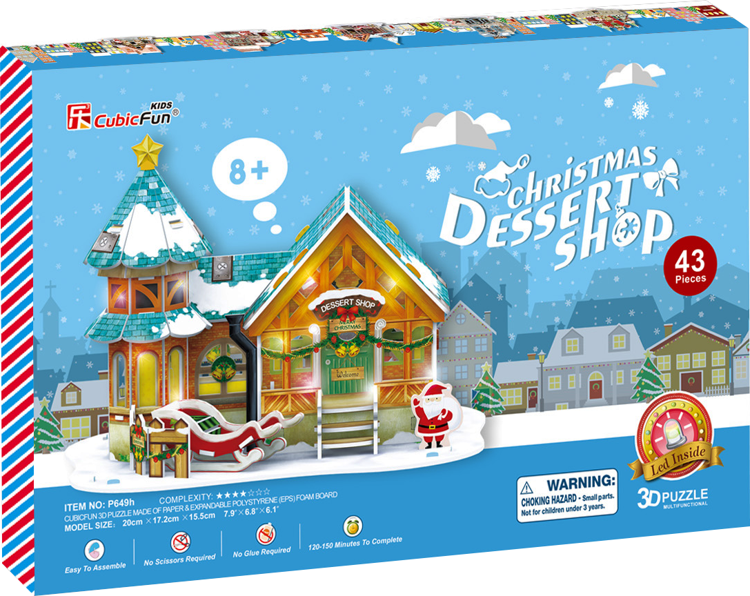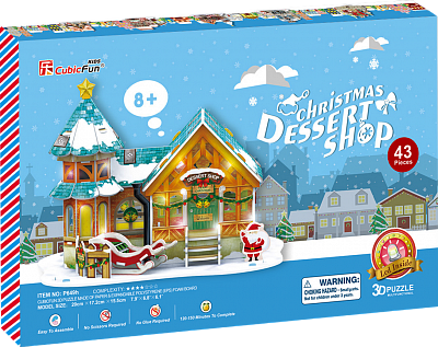 Новый год всегда дает прекрасную возможность провести его в кругу семьи. Соберите новый красивый 3D пазл с LED-подсветкой от CubicFun со своими близкими и запомните это замечательное время надолго! 3Д Пазл имеет LED-подсветку, рождественская кондитерская освещается. Набор станет прекрасным подарком для детей и взрослых. Новогодняя кондитерская имеет оригинальный праздничный дизайн, здание украшено различными тематическими украшениями. Пазл развивает мелкую моторику, память, воображение и логику ребенка. Легко собирается без дополнительных инструментов, ножниц и клея. Пазл изготовлен из прочных, качественных материалов. В набор входит фигурка деда мороза. Характеристики: Количество деталей пазла: 43 шт.; Рекомендованный возраст: 8+