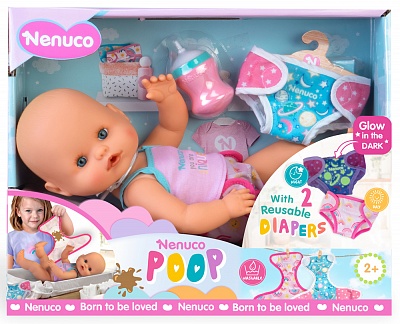 Набор с пупсом Nenuco ""Какающий пупс"" от Famosa – то, что нужно для малыша. Крутой дизайн пупса в сочетании со звуковыми эффектами и специальной функцией пупса делает его отличным подарком для девочки по любому поводу. • Игрушка имеет оригинальный дизайн – выполнена в виде малыша в ярком костюмчике; • В комплект входят 2 игрушечных подгузника, которые светятся в темноте и бутылочка, которой нужно поить малыша. Пупс умеет пить водичку из бутылочки и ходить в туалет (жидкая водичка коричневого цвета); • Куколка имеет подвижные ручки, ножки и голову; • Игрушка развивает мелкую моторику, фантазию и способствует развитию социальных навыков при игре с друзьями. Характеристики: • Рекомендуемый возраст: 2+.