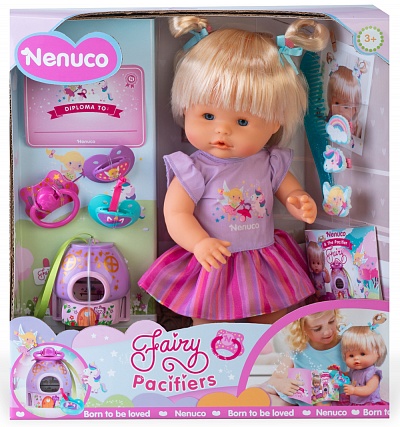 Набор с куклой Nenuco ""Сказочные пустышки"" от Famosa – то, что нужно для малыша. Крутой дизайн пупса в сочетании с аксессуарами делает его отличным подарком для девочки по любому поводу. • Игрушка имеет оригинальный дизайн – выполнена в виде малышки в ярком костюмчике с двумя милыми хвостиками; • В наборе помимо пупса вы найдете 3 соски, чехол для сосок в виде домика, расческу, 3 резинки для волос, сертификат и книжечку со сказкой, что поможет разнообразить взаимодействие с игрушкой; • Пупс имеет подвижные ручки, ножки и голову; • Игрушка развивает мелкую моторику, фантазию и способствует развитию социальных навыков при игре с друзьями. Характеристики: • Рекомендуемый возраст: 3+