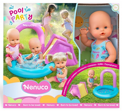 Набор с пупсом Nenuco ""Водная вечеринка"" от Famosa – то, что нужно для малыша в летнюю жару. Крутой дизайн пупса в сочетании с надувной горкой делает его отличным подарком для девочки по любому поводу. • Игрушка имеет оригинальный дизайн – выполнена в виде пупса в ярком костюмчике для плавания; • В наборе помимо куклы вы найдете надувной бассейн с горкой, в котором вы можете купать пупса, скатывать с горки и плескаться вместе с ним; • Пупс имеет подвижные ручки, ножки и голову; • Игрушка развивает мелкую моторику, фантазию и способствует развитию социальных навыков при игре с друзьями. Характеристики: • Рекомендуемый возраст: 3+.