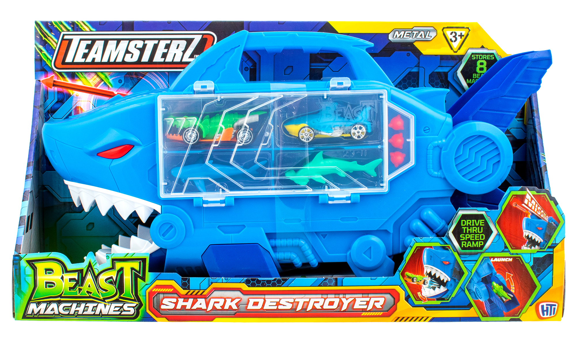 Машинка транспортер "Shark Destroyer" — это увлекательная игрушка от Teamsterz, которая погрузит ребенка в мир захватывающих морских приключений! • Центральным элементом набора является грозная акула, в которой можно хранить машинки; • Транспортер в стиле акулы имеет встроенную рампу скорости, а так же ракетную установку; • Игровой набор оснащен различными элементами, которые делают игровой процесс более динамичным и увлекательным, создавая эффект захватывающего приключения; • Акула вмещает в себя 8 машин; • Игрушка имеет колёса, что позволяет свободно её перемещать. Характеристики: • Рекомендованный возраст: 3+ В комплекте: • Машинка-транспортер, 4 фигурки