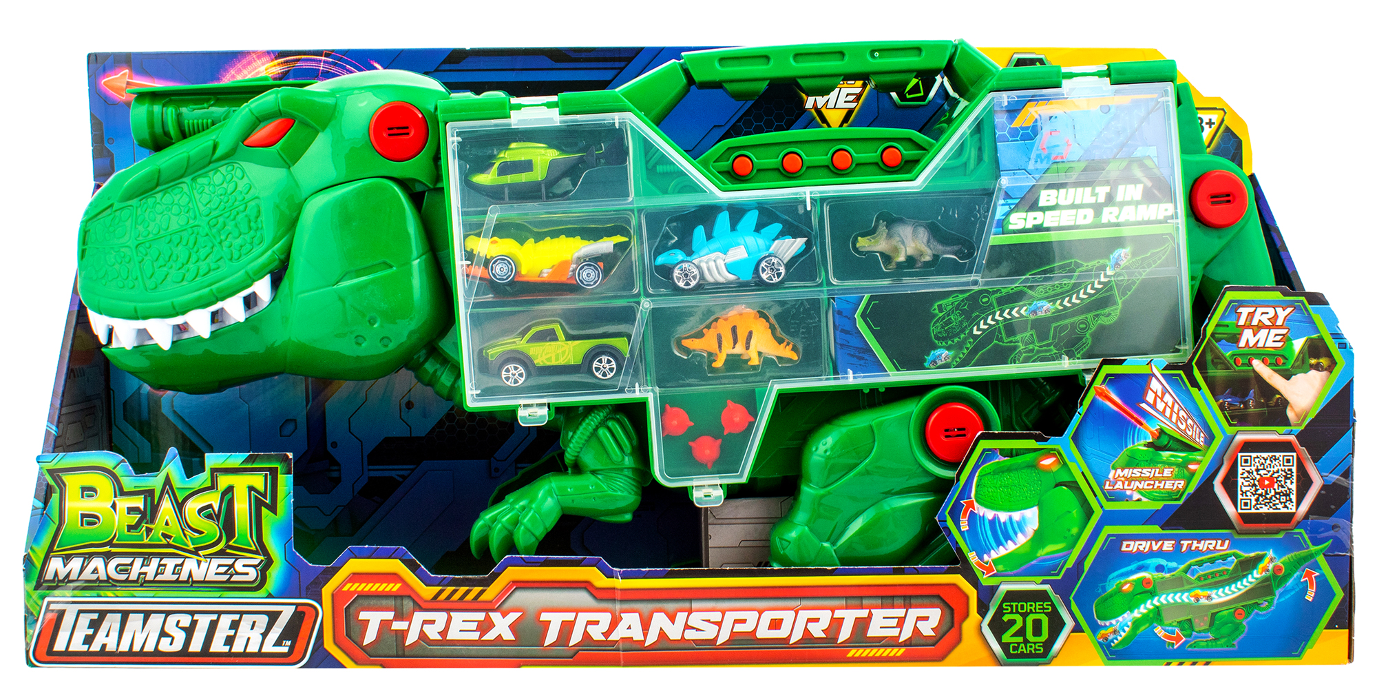 Машинка-транспортер "Тираннозавр" из серии Teamsterz с функциями света и звука — это крутая игрушка, соединяющая в себе мир динозавров и техники. Благодаря своему яркому дизайну в виде динозавра и интерактивным эффектам, она создаст атмосферу настоящих приключений и точно придется по вкусу ребенку. • Центральным элементом набора является грозный тираннозавр, в котором можно хранить машинки; • Игрушка издает реалистичные звуки рычания, что делает игровой процесс более захватывающим и насыщенным; • Игрушка имеет ручку для переноски, что позволяет удобно носить её с собой; • Транспортер имеет встроенную рампу скорости, а также ракетную установку; • Динозавр имеет 20 мест для машин; • Эта игрушка идеально подойдет для маленьких поклонников динозавров и техники, предлагая уникальные игровые возможности с яркими эффектами. Характеристики: • Рекомендованный возраст: 3+ В комплекте: • Транспортер ""Акула-динозавр"", 6 фигурок, 3 ракеты, 2 батарейки AAA.