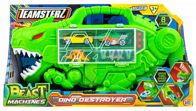 Машинка-транспортер "Dino Destroyer" из серии Teamsterz— это крутая игрушка, соединяющая в себе мир динозавров и техники. Благодаря своему яркому дизайну в виде динозавра она создаст атмосферу настоящих приключений и точно придется по вкусу ребенку. • Центральным элементом набора является грозный динозавр, в котором можно хранить машинки; • Транспортер в стиле динозавра имеет встроенную рампу скорости, а так же ракетную установку; • Игровой набор оснащен различными элементами, которые делают игровой процесс более динамичным и увлекательным, создавая эффект захватывающего приключения; • Динозавр вмещает в себя 8 машин; • Игрушка имеет ручку для переноски, что позволяет удобно носить её с собой; • Эта игрушка идеально подойдет для маленьких поклонников динозавров и техники, предлагая уникальные игровые возможности с яркими эффектами. Характеристики: • Рекомендованный возраст: 3+ В комплекте: • Транспортер ""динозавр"", 2 фигурки и 2 машинки.