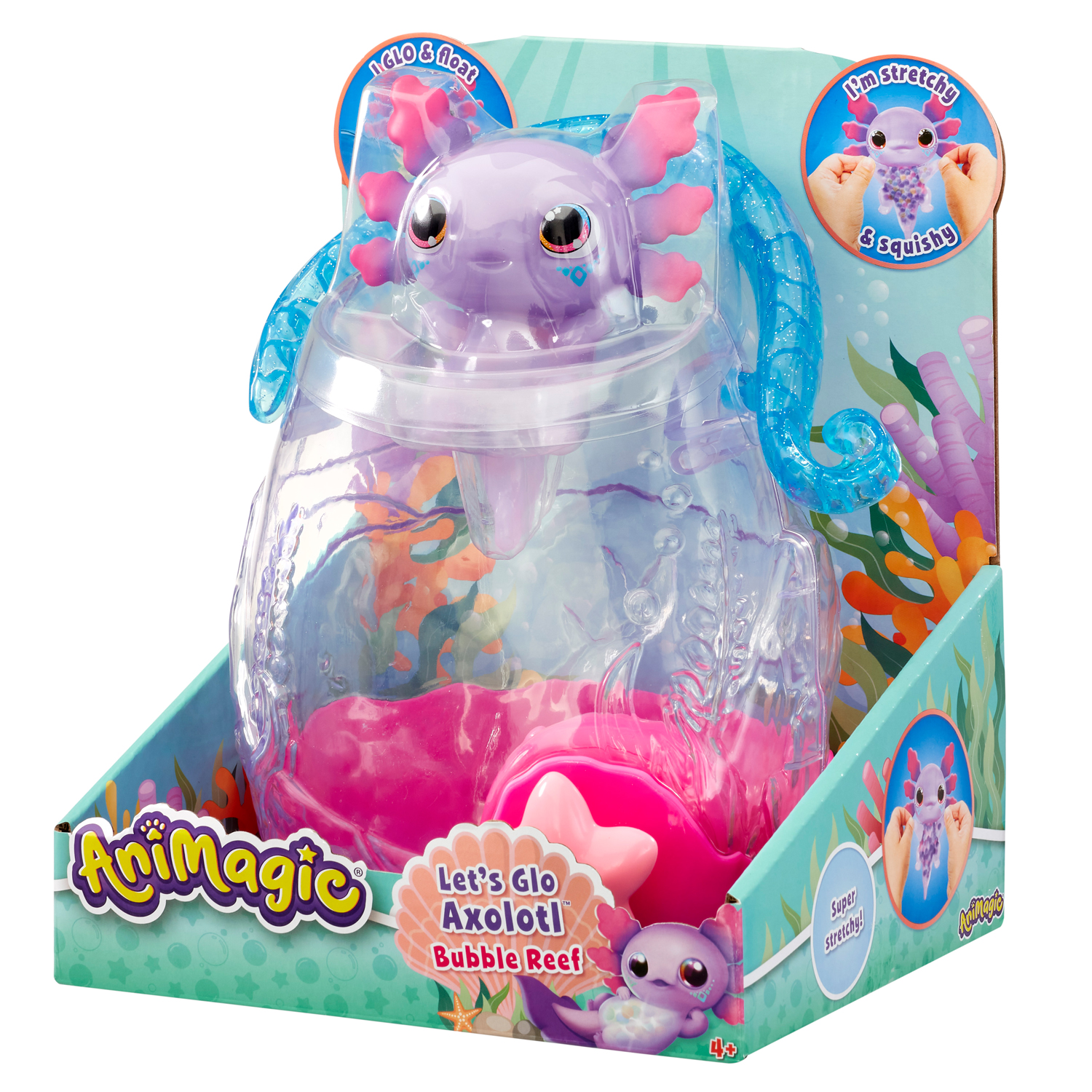 Игровой набор "Аксолотль с аквариумом" от AniMagic станет отличным подарком для юного любителя подводного мира. Набор представляет собой стильный аквариум и милого светящегося сквиша аксолотля, который держится на поверхности воды и начинает светиться при соприкосновении ней, такое сочетание создает идеальные условия для развития воображения ребенка. • Набор имеет яркий дизайн - включает в себя очаровательного аксолотля с мягким тельцем наполненным гелевыми шариками и прозрачный аквариум с декоративными элементами; • Аквариум оснащен специальной механической кнопкой в форме морской звезды, которая создает пузырьки при нажатии – игра становится еще более увлекательной. • При погружении в воду игрушка начинает мерцать, создавая волшебную атмосферу; • Можно играть с аксолотлем отдельно как с сквишем или создавать целые подводные сценки в аквариуме; • Когда аксолотль высыхает – магическим образом он перестает светиться; • Набор способствует развитию мелкой моторики, цветовосприятия и социальных навыков. Характеристики: • Рекомендуемый возраст: 4+